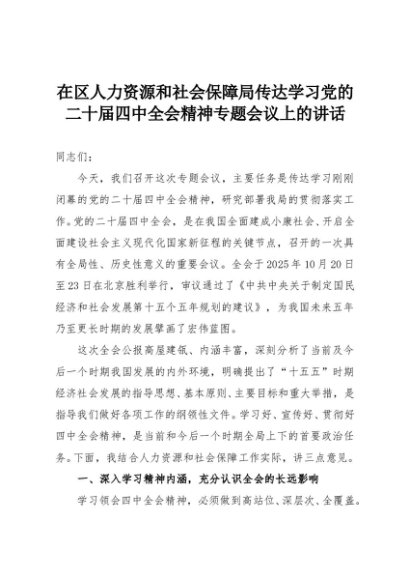 【七哥公文】2025年:在区人力资源和社会保障局传达学习党的二十届四中全会精神专题会议上的讲话+更多免费公文+VX:QiGeGongWen2024