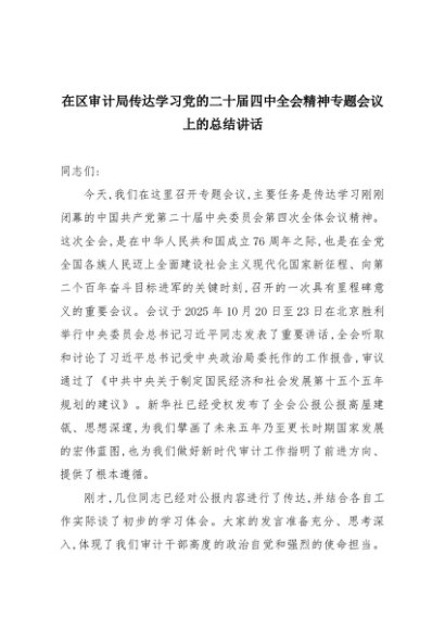 【七哥公文】2025年:在区审计局传达学习党的二十届四中全会精神专题会议上的总结讲话+更多免费公文+VX:QiGeGongWen2024