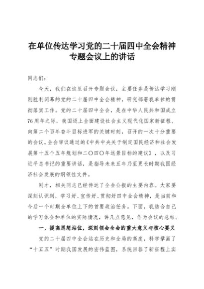 【七哥公文】2025年:在单位传达学习党的二十届四中全会精神专题会议上的讲话+更多免费公文+VX:QiGeGongWen2024