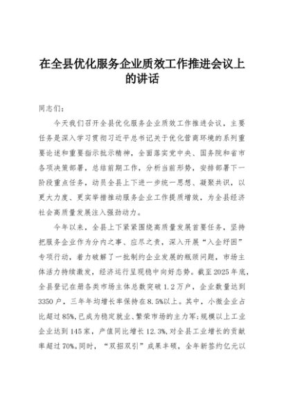 / 【七哥公文】2025年:在全县优化服务企业质效工作推进会议上的讲话+更多免费公文+VX:QiGeGongWen2024