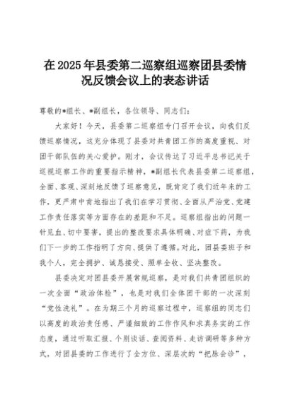 【七哥公文】2025年:在2025年县委第二巡察组巡察团县委情况反馈会议上的表态讲话+更多免费公文+VX:QiGeGongWen2024