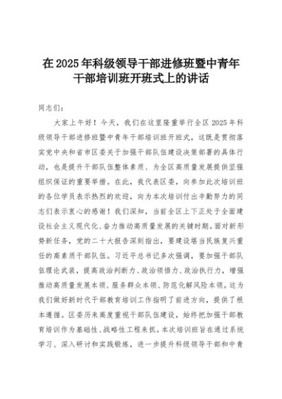 【七哥公文】2025年:在2025年科级领导干部进修班暨中青年干部培训班开班式上的讲话+更多免费公文+VX:QiGeGongWen2024