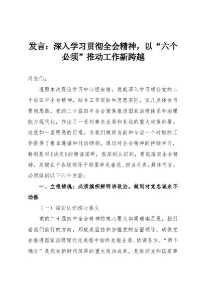 【七哥公文】2025年:发言:深入学习贯彻全会精神,以“六个必须”推动工作新跨越+更多免费公文+VX:QiGeGongWen2024