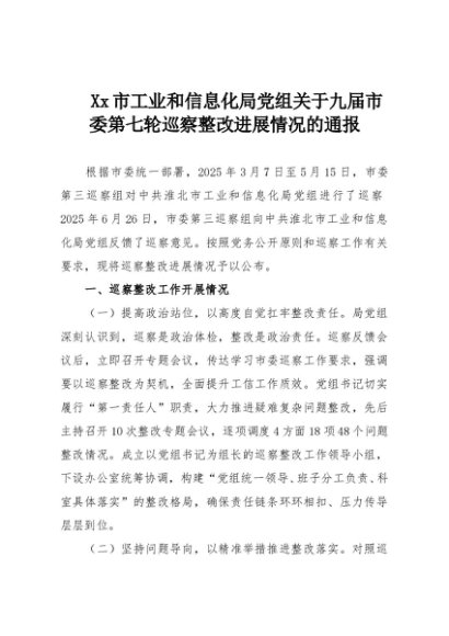 【七哥公文】2025年:Xx市工业和信息化局党组关于九届市委第七轮巡察整改进展情况的通报+更多免费公文+VX:QiGeGongWen2024