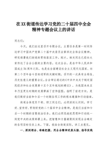 【七哥公文】2025年:在XX街道传达学习党的二十届四中全会精神专题会议上的讲话+更多免费公文+VX:QiGeGongWen2024