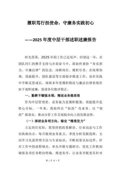 【七哥公文】2025年:2025年度中层干部述职述廉报告:履职笃行担使命,守廉务实践初心+更多免费公文+VX:QiGeGongWen2024
