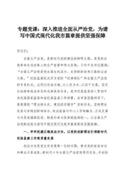 【七哥公文】2025年:专题党课:深入推进全面从严治党,为谱写中国式现代化我市篇章提供坚强保障+更多免费公文+VX:QiGeGongWen2024