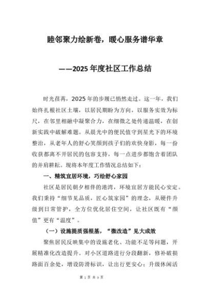 【七哥公文】2025年:2025年度社区工作总结:睦邻聚力绘新卷,暖心服务谱华章+更多免费公文+VX:QiGeGongWen2024