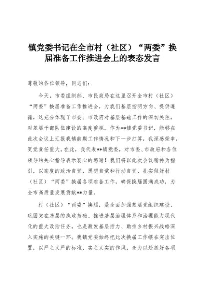 【七哥公文】2025年:镇党委书记在全市村(社区)“两委”换届准备工作推进会上的表态发言+更多免费公文+VX:QiGeGongWen2024