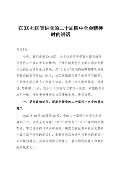 / 【七哥公文】2025年:在XX社区宣讲党的二十届四中全会精神时的讲话+更多免费公文+VX:QiGeGongWen2024