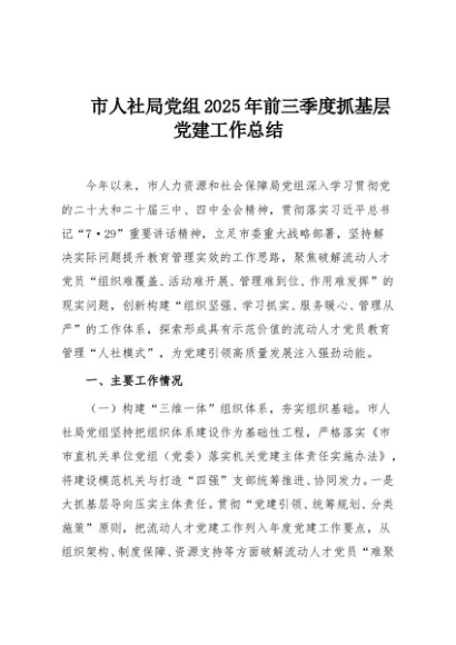 / 【七哥公文】2025年:市人社局党组2025年前三季度抓基层党建工作总结+更多免费公文+VX:QiGeGongWen2024