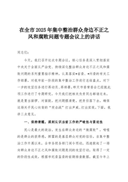 【七哥公文】2025年:在全市2025年集中整治群众身边不正之风和腐败问题专题会议上的讲话+更多免费公文+VX:QiGeGongWen2024
