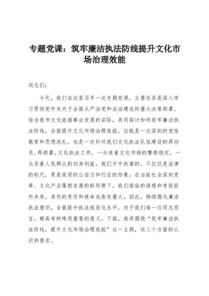 / 【七哥公文】2025年:专题党课:筑牢廉洁执法防线提升文化市场治理效能+更多免费公文+VX:QiGeGongWen2024