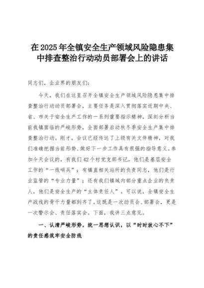 【七哥公文】2025年:在2025年全镇安全生产领域风险隐患集中排查整治行动动员部署会上的讲话+更多免费公文+VX:QiGeGongWen2024