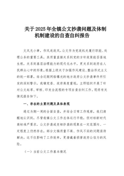 【七哥公文】2025年:关于2025年全镇公文抄袭问题及体制机制建设的自查自纠报告+更多免费公文+VX:QiGeGongWen2024