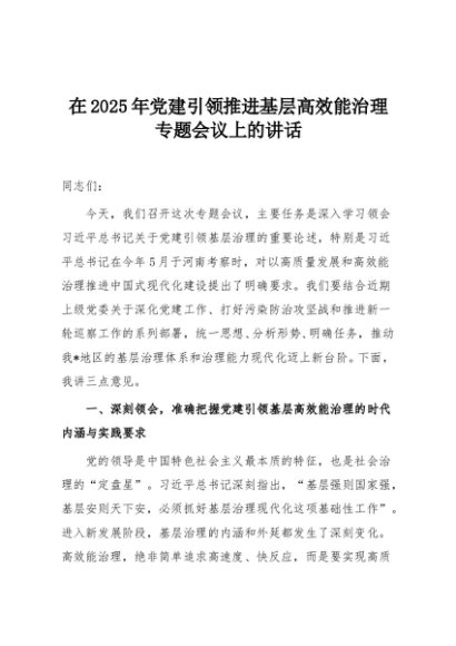 【七哥公文】2025年:在2025年党建引领推进基层高效能治理专题会议上的讲话+更多免费公文+VX:QiGeGongWen2024