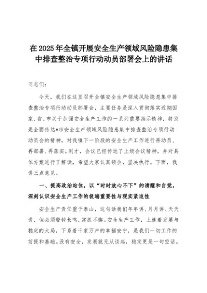 【七哥公文】2025年:在2025年全镇开展安全生产领域风险隐患集中排查整治专项行动动员部署会上的讲话+更多免费公文+VX:QiGeGongWen2024
