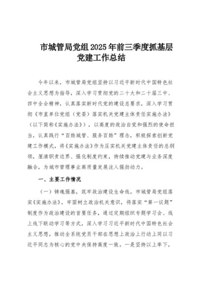 / 【七哥公文】2025年:市城管局党组2025年前三季度抓基层党建工作总结+更多免费公文+VX:QiGeGongWen2024