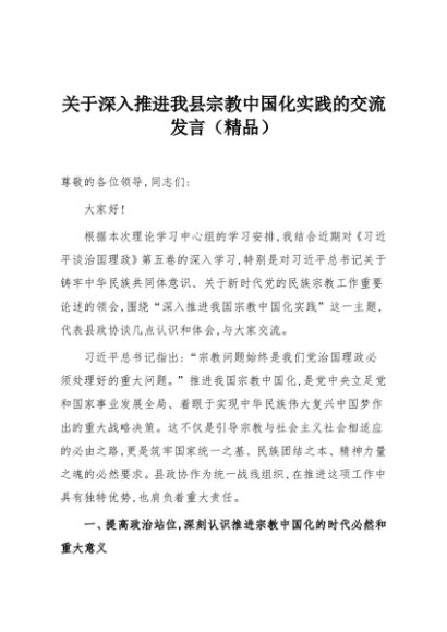 / 【七哥公文】2025年:关于深入推进我县宗教中国化实践的交流发言(精品)+更多免费公文+VX:QiGeGongWen2024