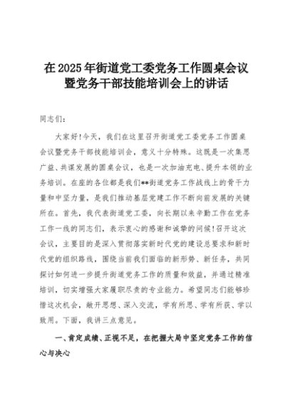 【七哥公文】2025年:在2025年街道党工委党务工作圆桌会议暨党务干部技能培训会上的讲话+更多免费公文+VX:QiGeGongWen2024