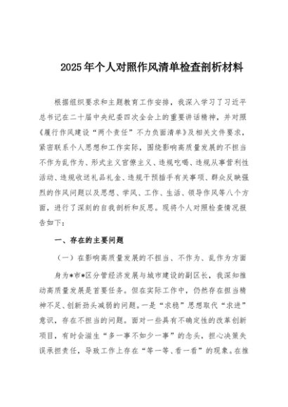 / 【七哥公文】2025年:2025年个人对照作风清单检查剖析材料+更多免费公文+VX:QiGeGongWen2024