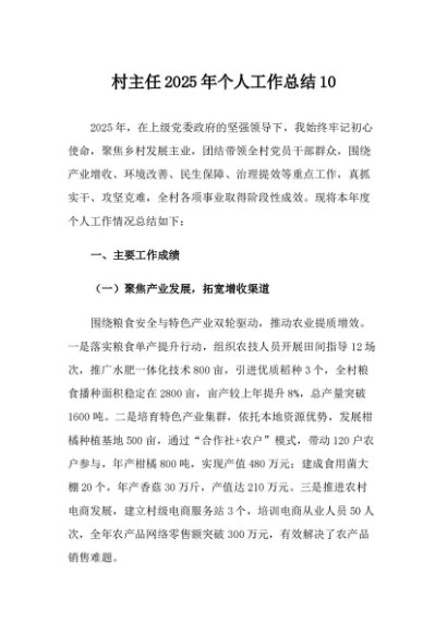 【七哥公文】2025年:村主任2025年个人工作总结10+更多免费公文+VX:QiGeGongWen2024