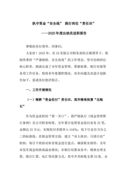 【七哥公文】2025年:2025年度出纳员述职报告:执守资金“安全线” 践行岗位“责任田”_副本+更多免费公文+VX:QiGeGongWen2024