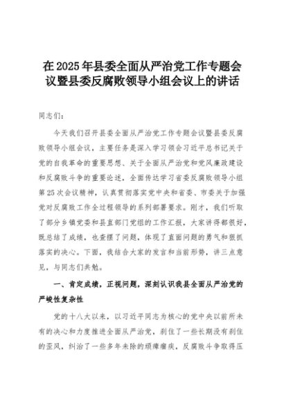 【七哥公文】2025年:在2025年县委全面从严治党工作专题会议暨县委反腐败领导小组会议上的讲话+更多免费公文+VX:QiGeGongWen2024