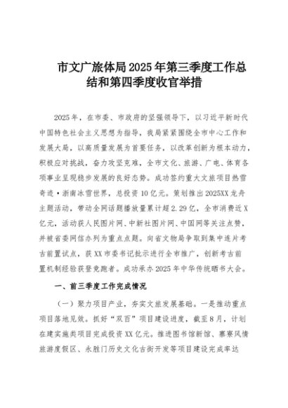 【七哥公文】2025年:市文广旅体局2025年第三季度工作总结和第四季度收官举措+更多免费公文+VX:QiGeGongWen2024