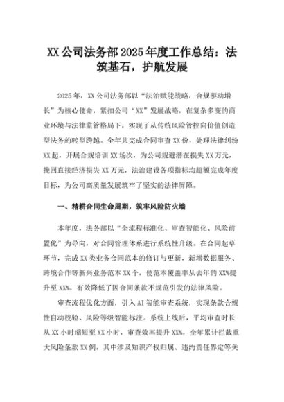 【七哥公文】2025年:XX公司法务部2025年度工作总结:法筑基石,护航发展_副本+更多免费公文+VX:QiGeGongWen2024