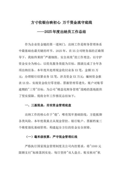 【七哥公文】2025年:2025年度出纳员工作总结:寸收银台映初心 万千资金流守底线_副本+更多免费公文+VX:QiGeGongWen2024