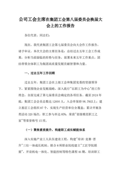【七哥公文】2025年:公司工会主席在集团工会第八届委员会换届大会上的工作报告+更多免费公文+VX:QiGeGongWen2024