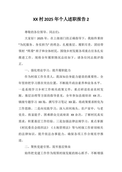 【七哥公文】2025年:XX村2025年个人述职报告2+更多免费公文+VX:QiGeGongWen2024
