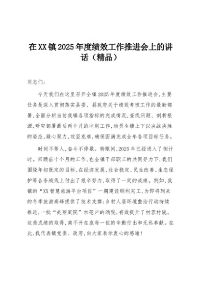 【七哥公文】2025年:在XX镇2025年度绩效工作推进会上的讲话(精品)+更多免费公文+VX:QiGeGongWen2024