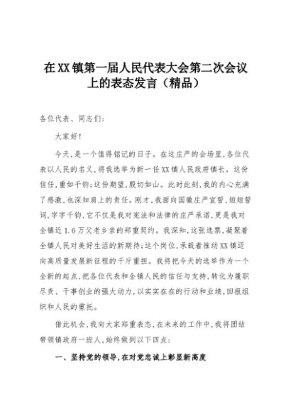 【七哥公文】2025年:在XX镇第一届人民代表大会第二次会议上的表态发言(精品)+更多免费公文+VX:QiGeGongWen2024