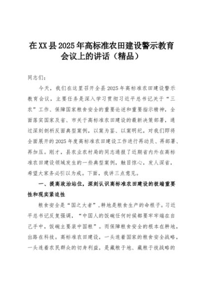 【七哥公文】2025年:在XX县2025年高标准农田建设警示教育会议上的讲话(精品)+更多免费公文+VX:QiGeGongWen2024
