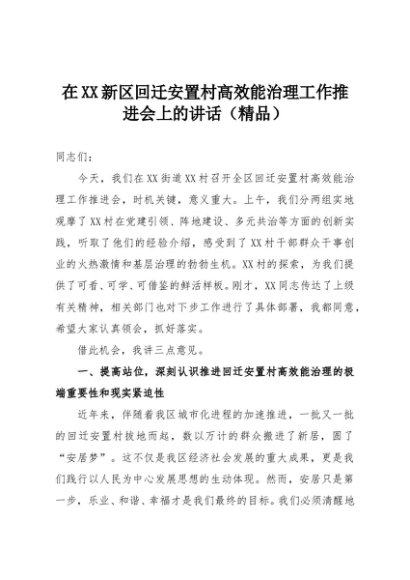 【七哥公文】2025年:在XX新区回迁安置村高效能治理工作推进会上的讲话(精品)+更多免费公文+VX:QiGeGongWen2024