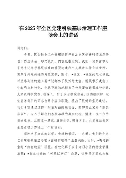 / 【七哥公文】2025年:在2025年全区党建引领基层治理工作座谈会上的讲话+更多免费公文+VX:QiGeGongWen2024