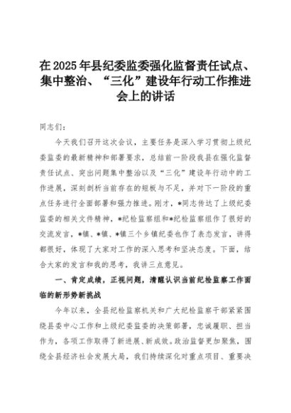【七哥公文】2025年:在2025年县纪委监委强化监督责任试点、集中整治、“三化”建设年行动工作推进会上的讲话+更多免费公文+VX:QiGeGongWen2024