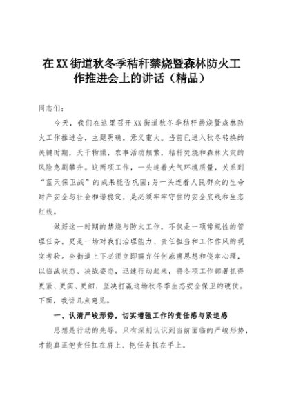 【七哥公文】2025年:在XX街道秋冬季秸秆禁烧暨森林防火工作推进会上的讲话(精品)+更多免费公文+VX:QiGeGongWen2024