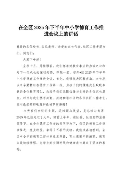 【七哥公文】2025年:在全区2025年下半年中小学德育工作推进会议上的讲话+更多免费公文+VX:QiGeGongWen2024