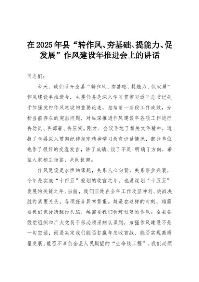 【七哥公文】2025年:在2025年县“转作风、夯基础、提能力、促发展”作风建设年推进会上的讲话+更多免费公文+VX:QiGeGongWen2024