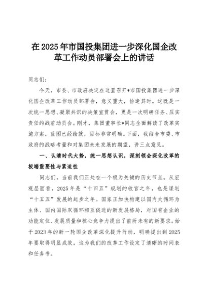 【七哥公文】2025年:在2025年市国投集团进一步深化国企改革工作动员部署会上的讲话+更多免费公文+VX:QiGeGongWen2024