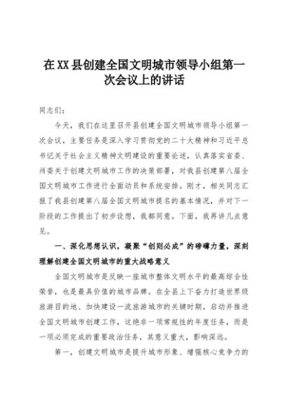 【七哥公文】2025年:在XX县创建全国文明城市领导小组第一次会议上的讲话+更多免费公文+VX:QiGeGongWen2024