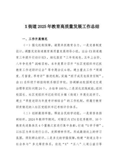 / 【七哥公文】2025年:X街道2025年教育高质量发展工作总结+更多免费公文+VX:QiGeGongWen2024