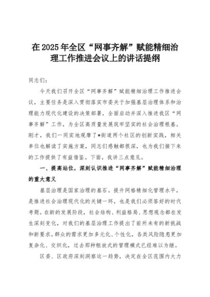 【七哥公文】2025年:在2025年全区“网事齐解”赋能精细治理工作推进会议上的讲话提纲+更多免费公文+VX:QiGeGongWen2024