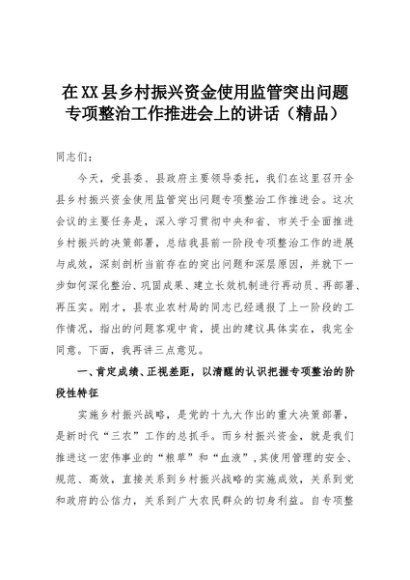 【七哥公文】2025年:在XX县乡村振兴资金使用监管突出问题专项整治工作推进会上的讲话(精品)+更多免费公文+VX:QiGeGongWen2024
