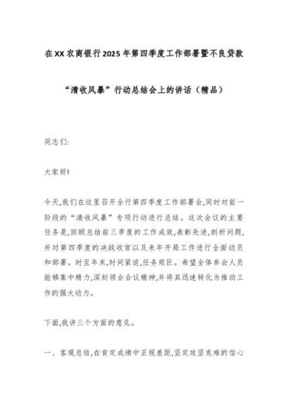 【七哥公文】2025年:在XX农商银行2025年第四季度工作部署暨不良贷款“清收风暴”行动总结会上的讲话(精品)_副本+更多免费公文+VX:QiGeGongWen2024