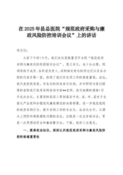 【七哥公文】2025年:在2025年县总医院“规范政府采购与廉政风险防控培训会议”上的讲话+更多免费公文+VX:QiGeGongWen2024