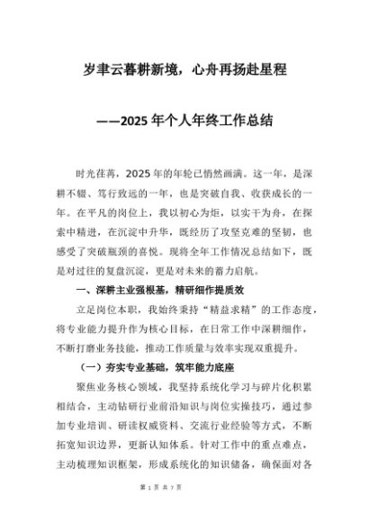 【七哥公文】2025年:2025年个人年终工作总结:岁聿云暮耕新境,心舟再扬赴星程+更多免费公文+VX:QiGeGongWen2024